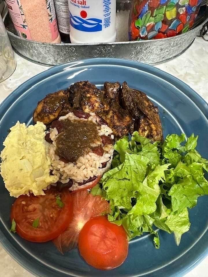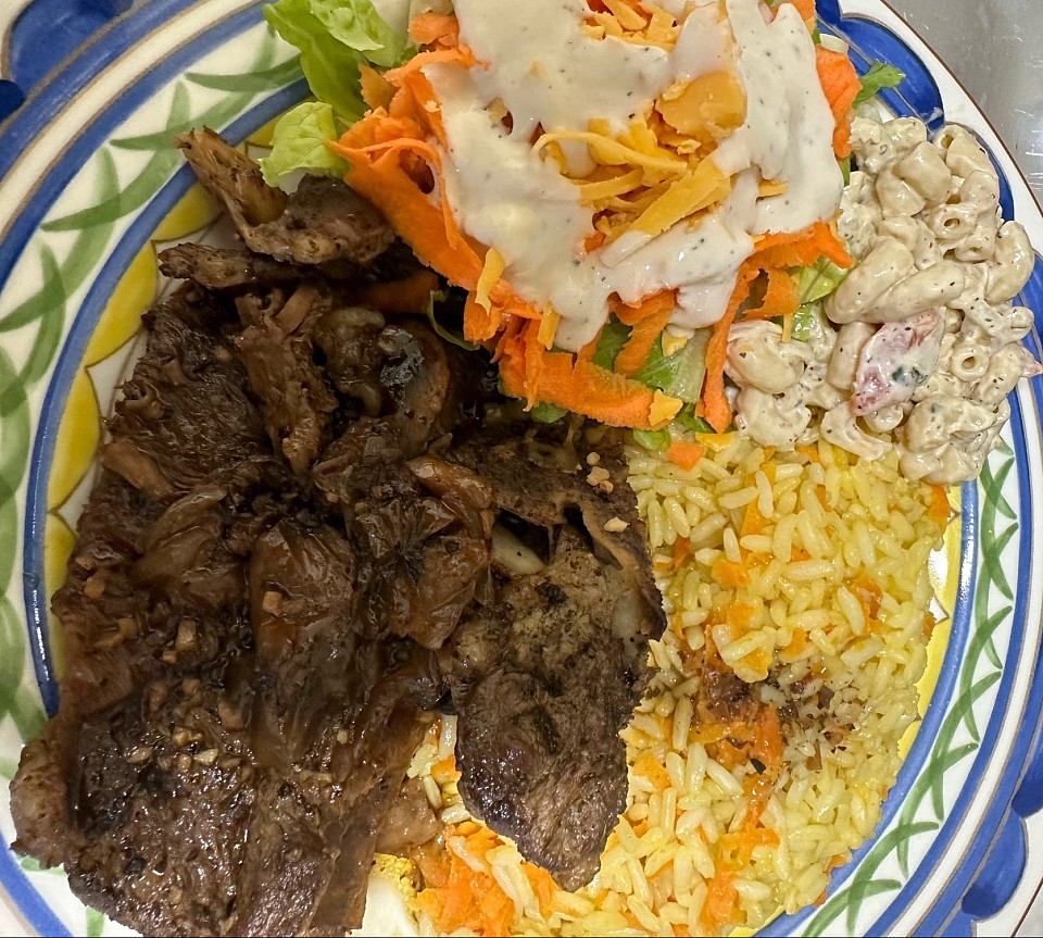 This is veal chops with carrot rice next to macaroni salad. The veal is well seasoned with a hint of my green seasonings